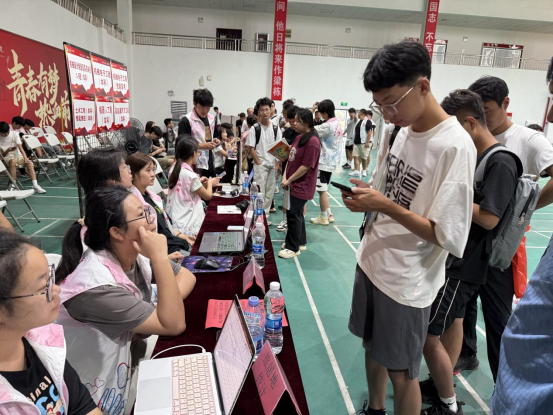 抵达体育馆报到区后,另一组队员早已就位。报到点队员们围坐桌前,专注地为新生登记并办理入学手续,新生们有序咨询的场景,能清晰感受到现场的高效与温馨,每一次耐心解答都传递着“让新生安心、让家长放心”的温度。