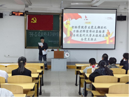 方腾书记现场宣读支部大会决议,对五名同志如期转正表示热烈祝贺。他强调,转正既是政治身份的升级,更是责任使命的加码,希望大家以此次转正为新起点,持续深化党的创新理论学习,不断加强党性修养,严守党的纪律规矩,在学习科研、志愿服务、校园建设等各项工作中勇挑重担,以先锋模范作用践行入党誓言,用实际行动诠释共产党员的初心使命。