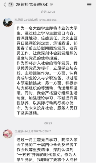 员工党员刘思煜在交流中谈道,本次线上主题党日学习让他深受触动,深切体会到党组织的温度与党员的使命担当。作为即将毕业的大四员工,他将以优秀党员为标杆,扎实完成毕业论文与求职各项准备,同时积极参与支部各类活动,以实际行动践行初心使命,为投身社会、服务人民打下坚实基础。