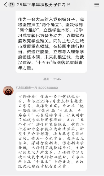 入党积极分子廖一凡结合自身机械专业背景分享感悟,此次学习让他明晰了专业学习与国家战略、武汉“五个中心”建设的紧密联系。他表示将立足专业深耕细作,聚焦智能制造、绿色制造领域锤炼科创本领,主动对接区域产业发展需求,用专业所长为“十五五”良好开局贡献青春力量。