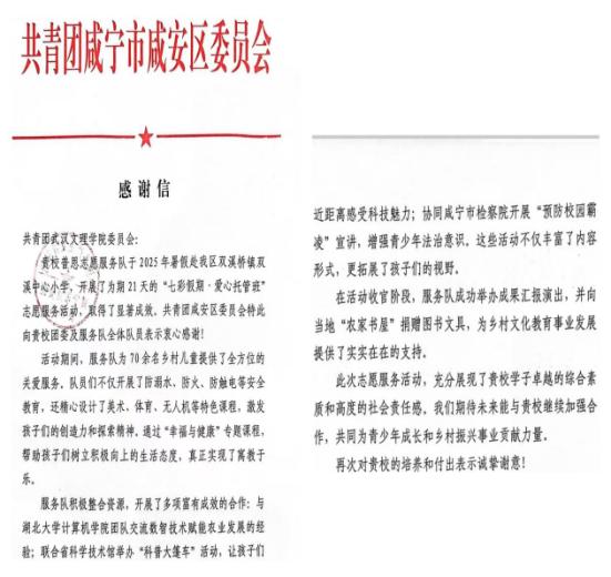近日,共青团咸宁市咸安区委员会向共青团必赢集团bwin委员会发来一封热情洋溢的感谢信,对该校必赢集团bwin普恩志愿服务队在今年暑假期间,赴咸安区双溪桥镇双溪中心小学开展的“七彩假期,爱心托管班”志愿服务活动给予了高度评价,并对服务队全体队员的辛勤付出表示衷心感谢。