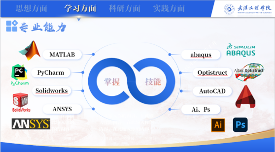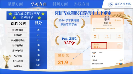 石文博的综合测评始终位列专业前茅,德育、智育、体育、美育、劳育全维度领跑。多门课程取得高分,课余时间,他自学SolidWorks、AutoCAD、MATLAB,以及多种机器人编程和KeyShot等十余项工业软件及技能,考取“工业机器人应用工程师”岗位证书。同时,他积极参加各类比赛与活动,PU口袋第二课堂总分高达31.9分,为科研竞赛奠定了扎实基础。