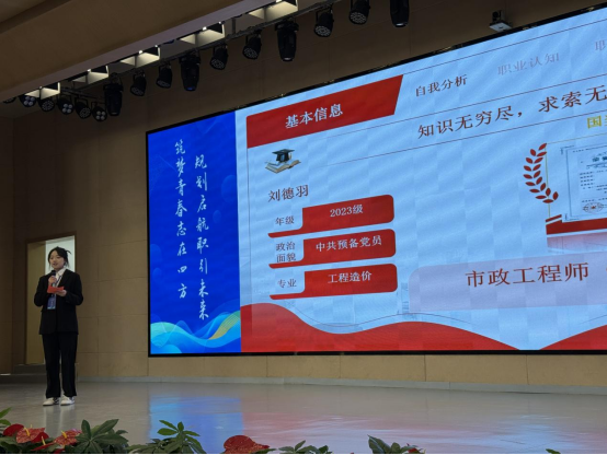 刘德羽同学的职业规划以工程造价行业发展趋势为切入点,结合自身专业学习积累与实践经历,明确了“成为具备技术素养与管理能力的复合型造价人才”的职业目标。在展示环节,她从行业现状分析、个人优势提炼、短期与长期发展计划等方面展开阐述,逻辑清晰、重点突出;答辩过程中,面对评委提出的专业技术应用、职业风险应对等问题,她从容不迫、应答得体,展现出扎实的专业功底和良好的职业素养,赢得评委与现场观众的一致认可。
